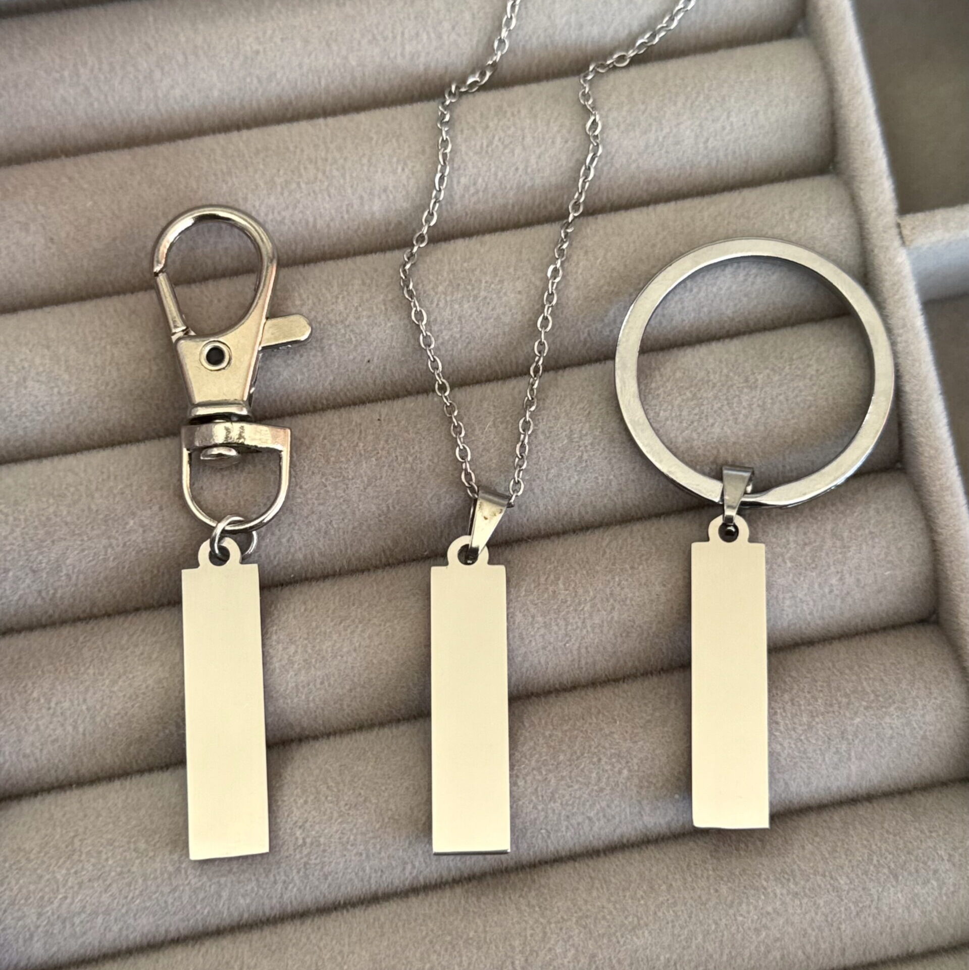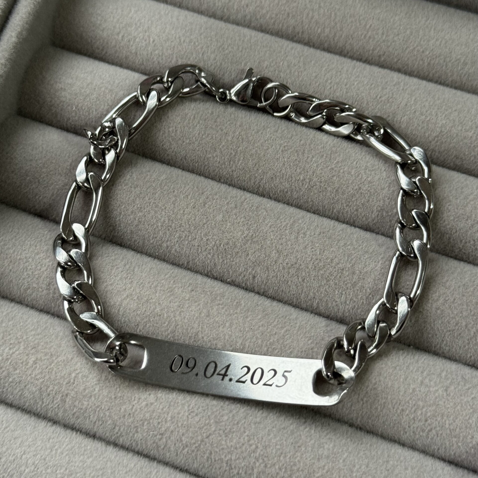 Grabado con láser de alta precisión sobre acero quirúrgico brillante, resistente al agua y al uso diario, sin perder su brillo ni color.
